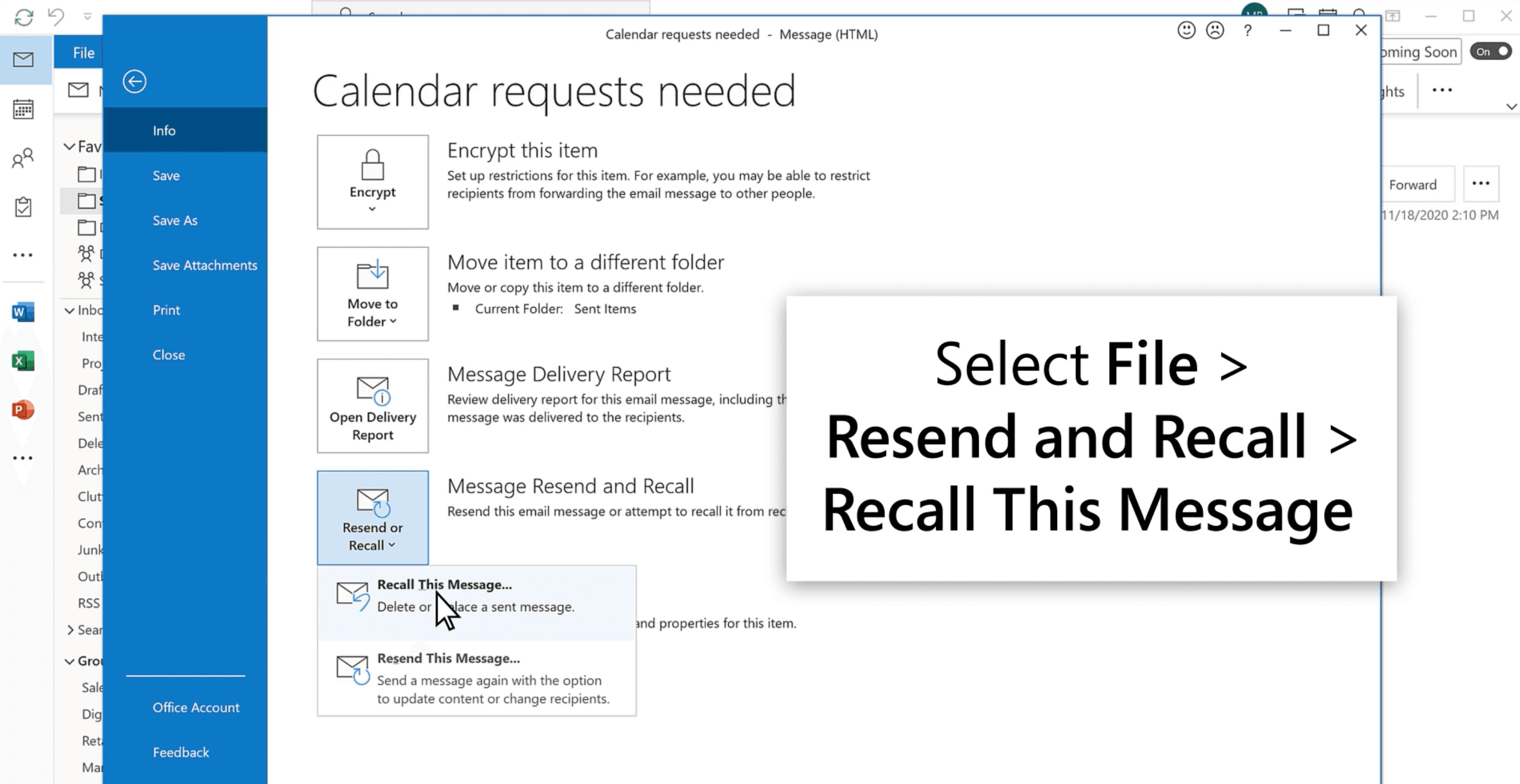 In the File window, choose Message Resend and Recall, then select Recall This Message. This opens Outlook’s built-in recall tool — the quickest way to take back or update an email before it’s read.